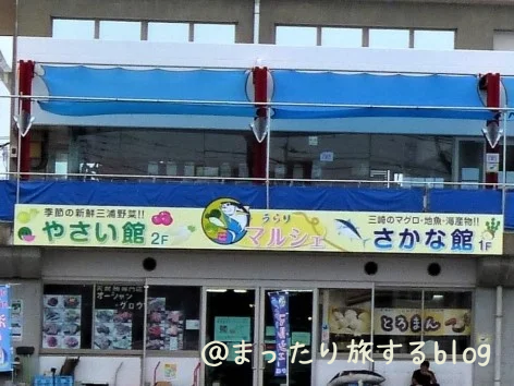 「うらりマルシェ」は三浦海業公社が運営し、マグロをはじめ旬の魚介類や野菜などを販売する「産直センター」です。マグロをメインにした小さな市場で、地元産の新鮮魚介野菜や、魚介を使った軽食も販売。マグロの希少部位も手に入れることができます。 一階に「さかな館」、2階に「やさい館」があります。