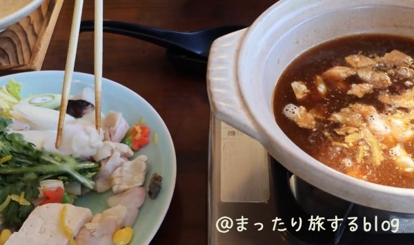 なべの出しはあん肝で濃厚ながらくどさがなく、マイルドな味つけです。
