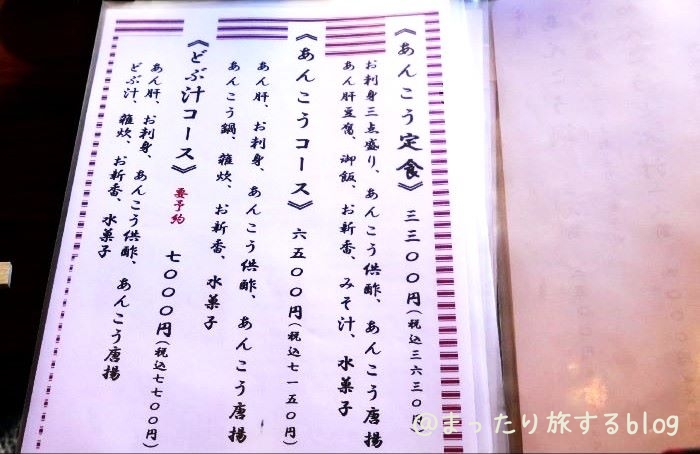 - あんこう鍋、刺身三点盛、あんこう唐揚、あん肝、あんこう供酢、雑炊セット、フルーツ